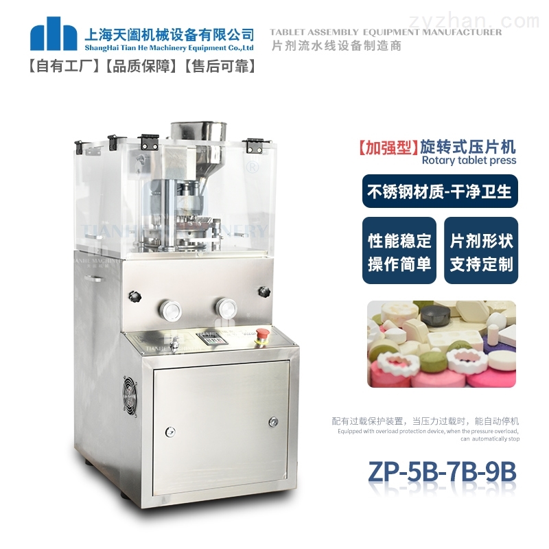 本机是一种单压式自动旋转,连续压片的机器,将颗料状原料压制成各种片剂。它主要用于制药业的片剂生产,同时适用于化工、食品、电子等工业部门。外围罩壳为全封闭形式,材料采用不锈钢,内部台面用不锈钢材料,转台表面经过特殊处理,能保持表面光泽与防止交叉污染,符合GMP要求。装有透明玻璃的门窗,能清楚观察压片的状态,并且能全部打开,易于内部清理和保养。所有控制器和操作件均布局合理。采用变频调速装置进行电气调速,操作方便,转动平稳,安全准确。所有的传动装置均布置在机器内部,保持机件清洁。配有过载保护装置,当压力过载时,能自动停机。本机配有电磁制动电动机和其它安全保护装置,运行时也能调整与操作。